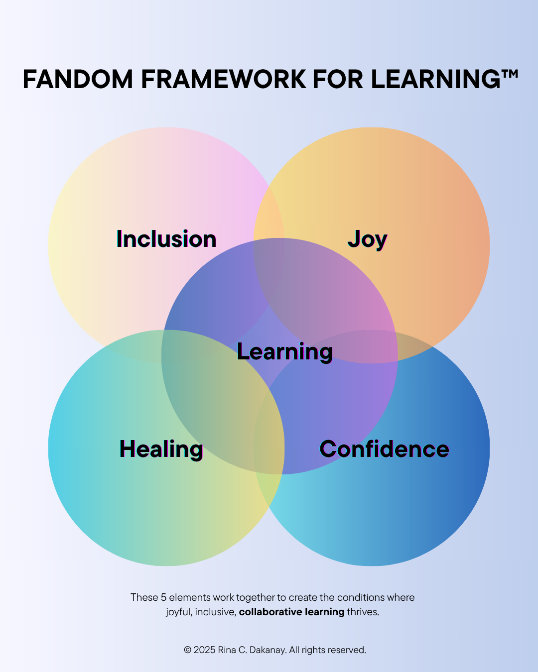 The Fandom Framework for Learning™ comprises five interconnected elements that emerged from my research, drawing on the insights and experiences of higher education instructors in the United States.